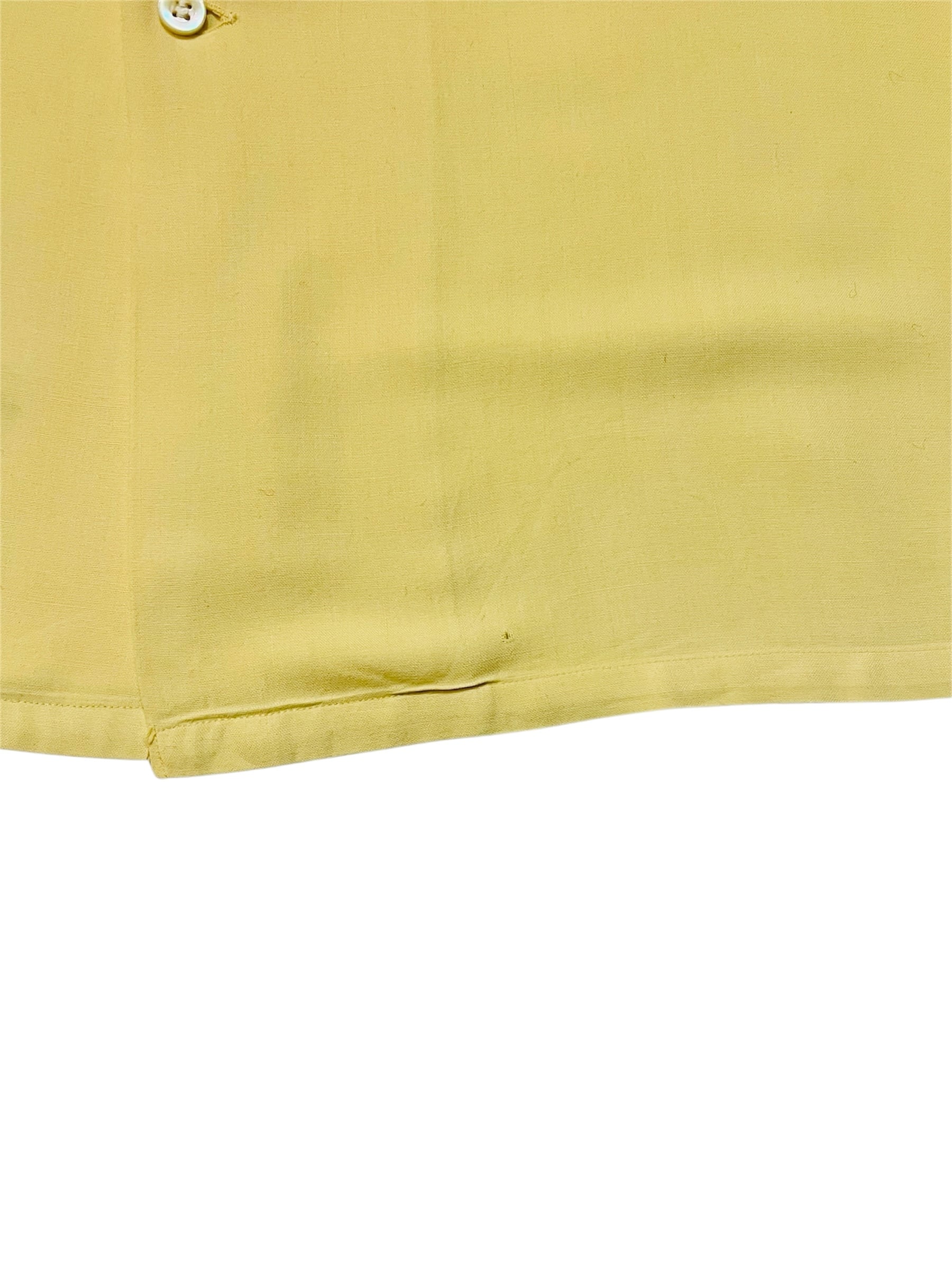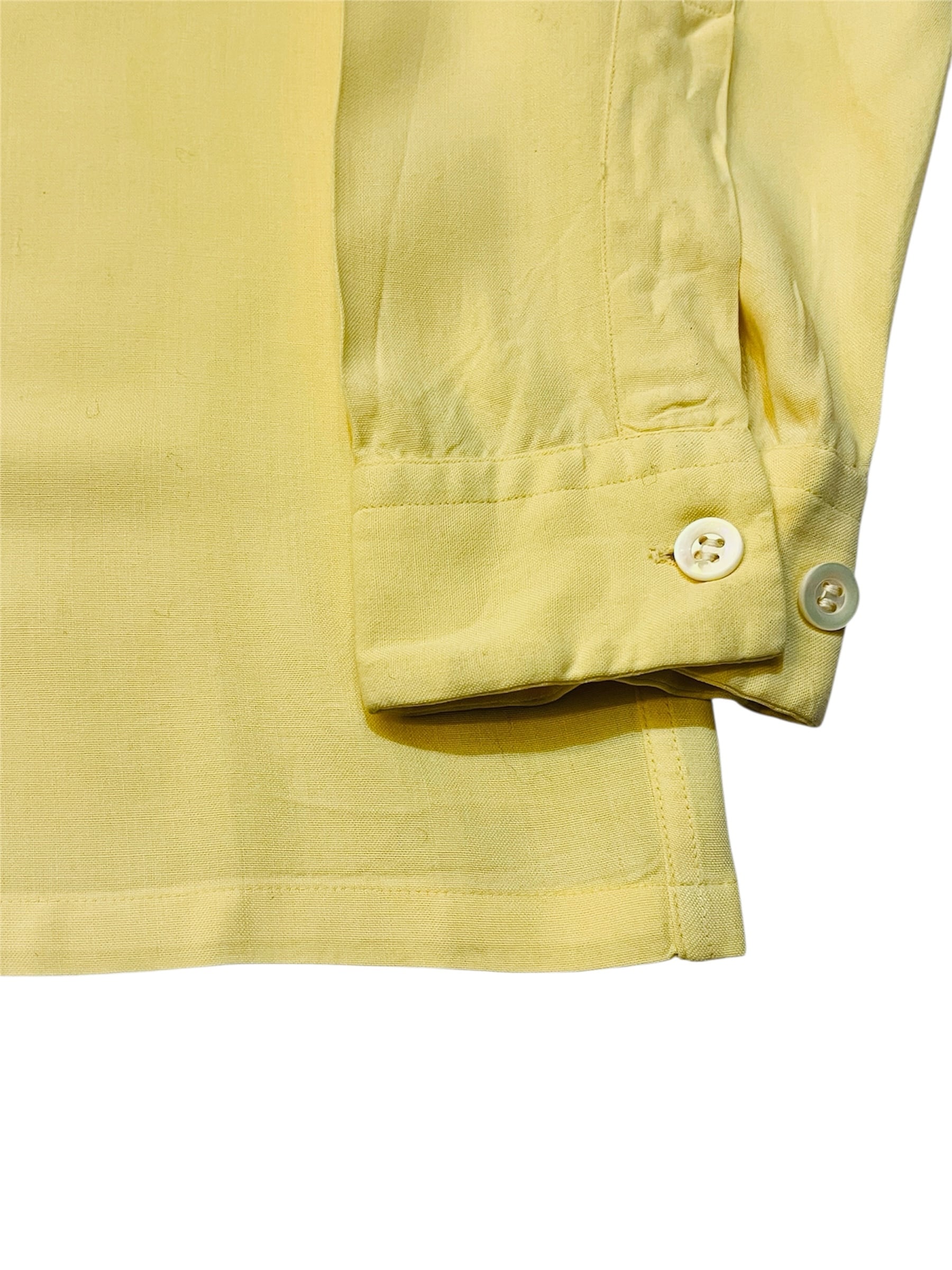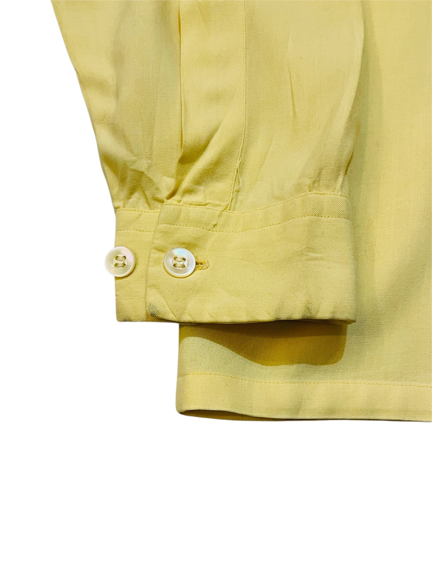 レーヨンギャバ素材でハンドステッチ入り、シェルボタンが使用されている50年代の良いところをギュッと1枚にしたようなディテールです。